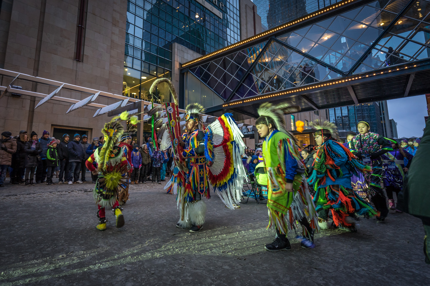 I had largely avoided the Superbowl hoopla, even with the prospect of the home team participating for the first time in history. But, the day before the big game, we decided on a lark that we should at least take in the sights downtown to say we had been there. We bundled up, parked at some distance, and took the train into the wilds of skyscraperland. I confess that I shot half-heartedly. I grabbed a few here and there. A man with a large sign imploring everyone to repent. Search lights shining on the tall building walls with a ski jump in the fore, strangely emerging from the flurries on what is usually a pedestrian thoroughfare that doesn’t require bindings and poles. As we walked along, a group of First Nations dancers began their display. The crowds parted to make room. The drum thumped and the singers wailed. In surreal quality of the lights, venue and whole scene was magnified.